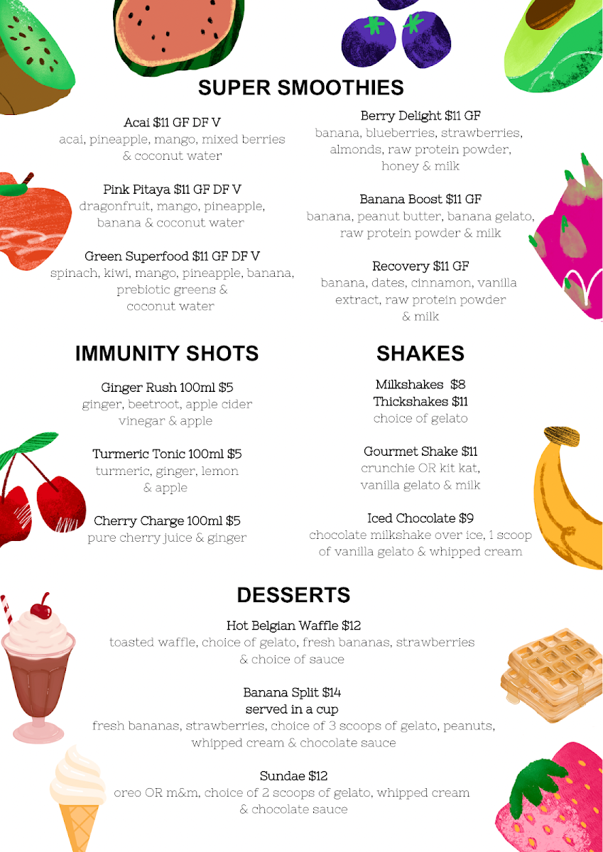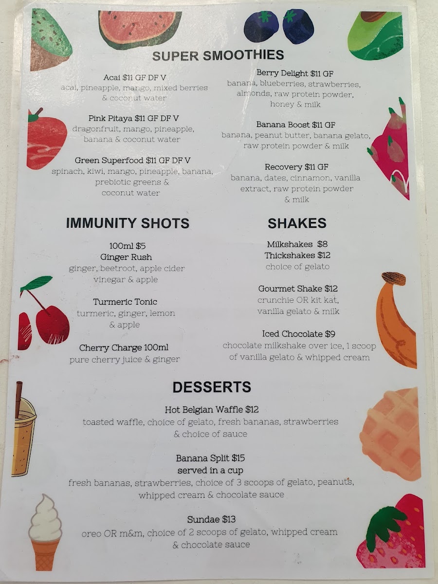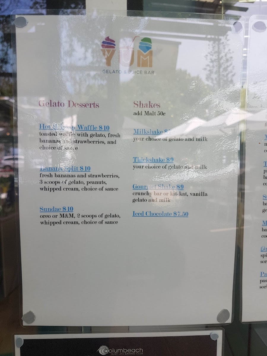 Yum Gelato Coolum at 1778 David Low Way offers a vibrant and indulgent menu that caters to both health-conscious and sweet-toothed visitors. Their Super Smoothies, including Acai, Pink Pitaya, Green SuperfoodBerry Delight, and Banana Boost, are packed with flavor, while the Immunity Shots like Ginger Rush, Turmeric Tonic, and Cherry Charge provide a zesty health boost. For those craving creamy indulgence, the Shakes section features Milkshakes, Thickshakes, Gourmet ShakeIced Chocolate, and more. Dessert lovers will enjoy treats such as the Hot Belgian Waffle, Banana Split, and classic Sundae. The menu also showcases an array of Acai Bowls-Original, Tropical Bliss, SnickersChocolate Nutella, and Biscoff-alongside Smoothie Bowls like the Pitaya Bowl and Green Bowl. Freshness is a priority with Fresh Juices including Ginger Bite, Green Goddess, Cold ZapperTropical Burst, and Immune Boost, as well as Freshly Squeezed options like Tropical Burst, Green Goddess, and LemonCold Zapper. For a savory twist, the menu features Bolognaise and Corona, rounding out a diverse selection that effortlessly balances fun, flavor, and nourishment. Every item feels thoughtfully crafted, making Yum Gelato Coolum a spot where healthy choices and indulgent treats coexist beautifully.