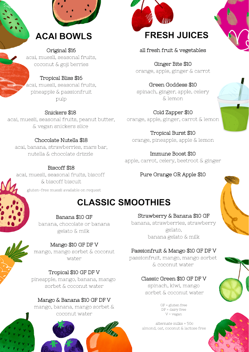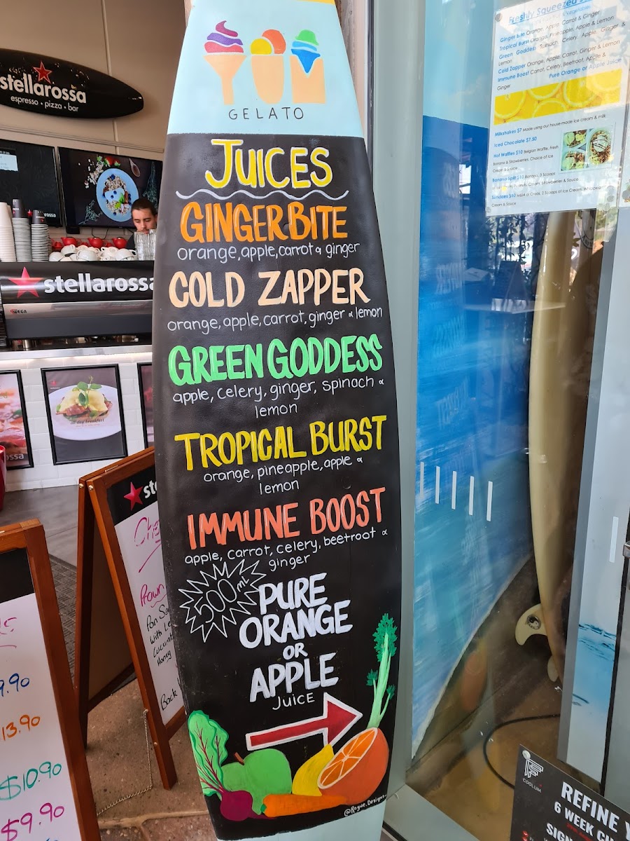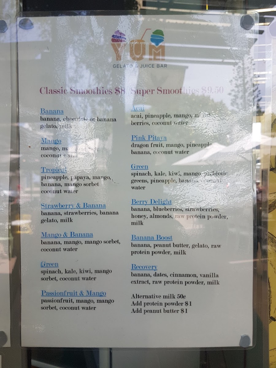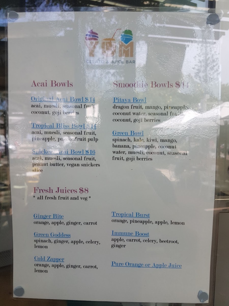 Yum Gelato Coolum at 1778 David Low Way offers a vibrant and indulgent menu that caters to both health-conscious and sweet-toothed visitors. Their Super Smoothies, including Acai, Pink Pitaya, Green SuperfoodBerry Delight, and Banana Boost, are packed with flavor, while the Immunity Shots like Ginger Rush, Turmeric Tonic, and Cherry Charge provide a zesty health boost. For those craving creamy indulgence, the Shakes section features Milkshakes, Thickshakes, Gourmet ShakeIced Chocolate, and more. Dessert lovers will enjoy treats such as the Hot Belgian Waffle, Banana Split, and classic Sundae. The menu also showcases an array of Acai Bowls-Original, Tropical Bliss, SnickersChocolate Nutella, and Biscoff-alongside Smoothie Bowls like the Pitaya Bowl and Green Bowl. Freshness is a priority with Fresh Juices including Ginger Bite, Green Goddess, Cold ZapperTropical Burst, and Immune Boost, as well as Freshly Squeezed options like Tropical Burst, Green Goddess, and LemonCold Zapper. For a savory twist, the menu features Bolognaise and Corona, rounding out a diverse selection that effortlessly balances fun, flavor, and nourishment. Every item feels thoughtfully crafted, making Yum Gelato Coolum a spot where healthy choices and indulgent treats coexist beautifully.